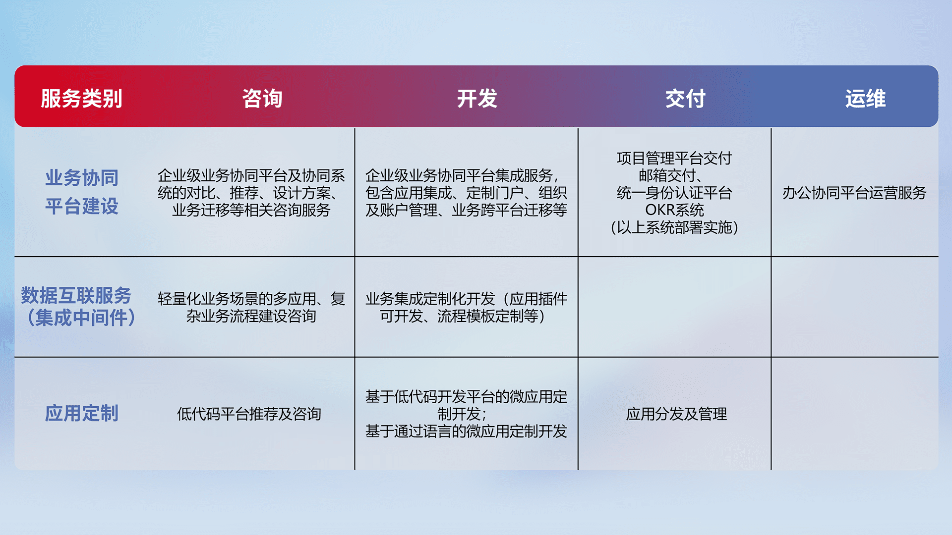 针对钉钉、、企微、、、IDaas等平台级产品提供产品的规划、、、、方案、、、交付、、定制化开发等服务,,实现如统一协同办公、、智能客户服务、、混合会议管理、、、、智能数据查询、、、、等业务场景,,,,实现数字化转型。。。。
