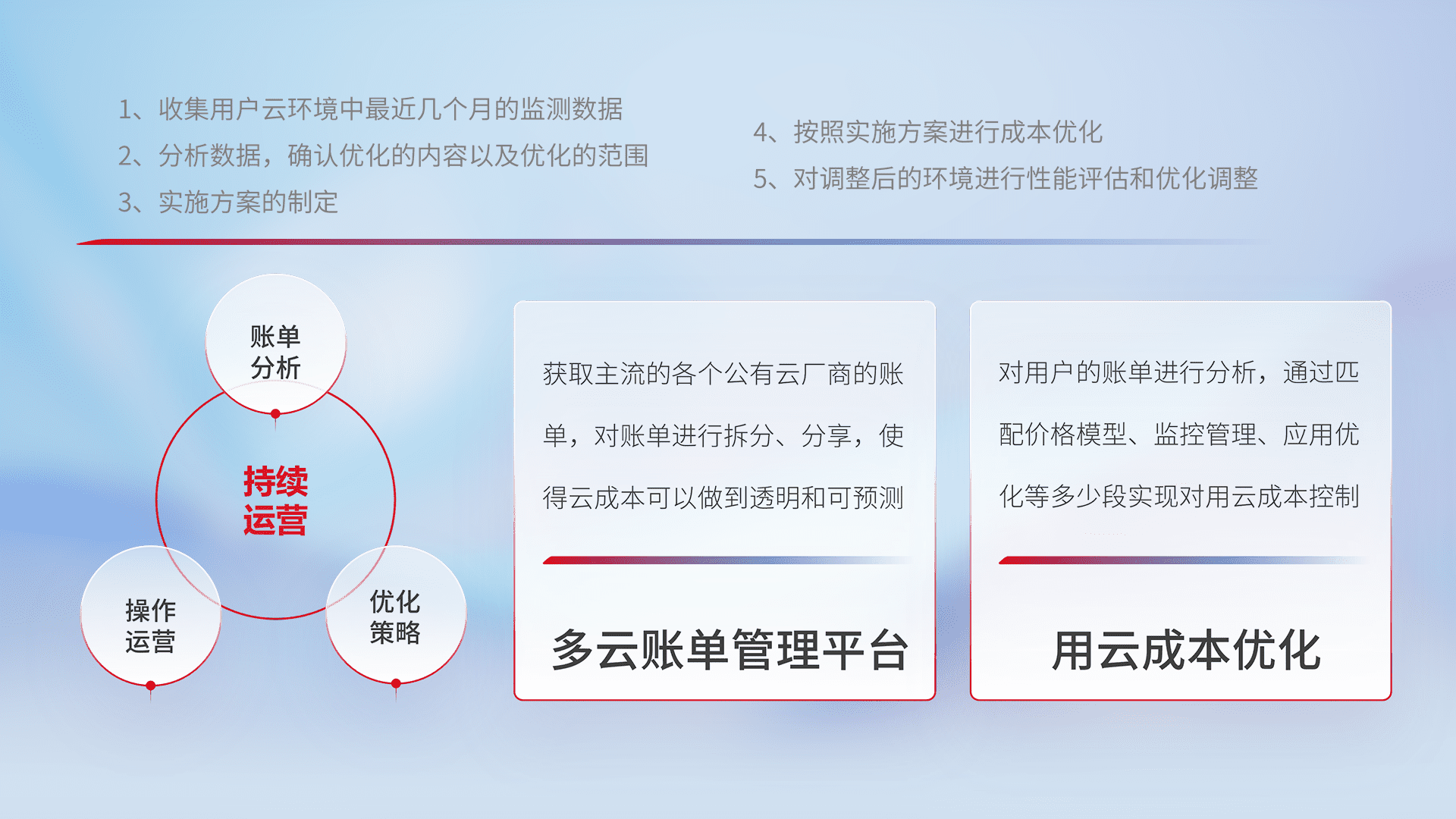 通过多云纳管,,,,以统一的资源数据模型把客户的云资源进行抽象和封装,,,进而实现对多云资源的统一操作,,保障云资源管理的可靠性、、稳定性与可用性。。量身定制化运维内容,,,,配置、、开发运维、、、补丁管理、、、备份、、、监控、、、、认证和访问管理、、审计和日常巡检等,,,保障在用云过程中的可靠度,,,,稳定度以及高可用率。。