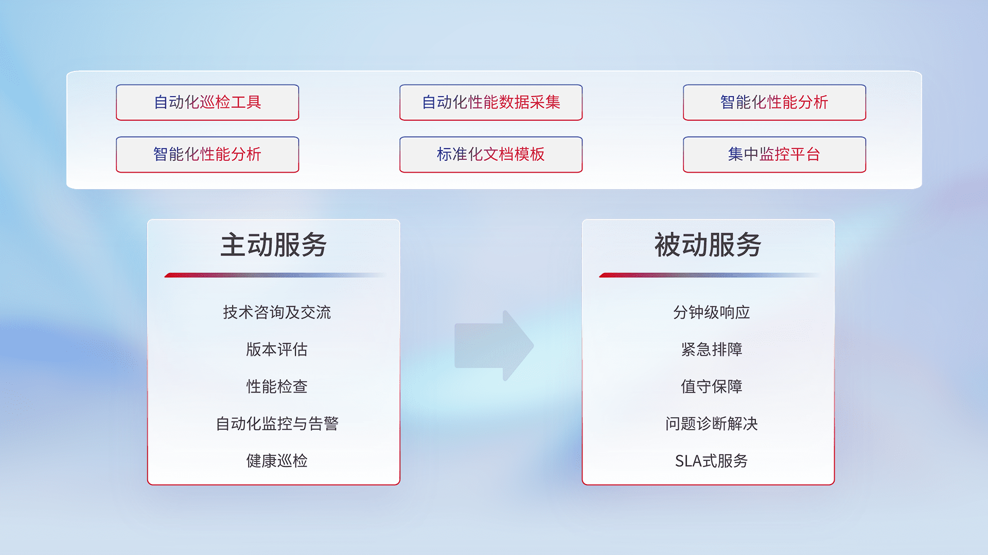 智能化工具和标准化文档,,,,保障服务质量,,提供主动服务(包含技术咨询、、版本评估、、性能检查、、、、自动化监控与告警、、健康巡检)和被动服务包含(分钟级响应、、、、紧急排障、、、值守保障、、、、问题诊断解决、、、、SLA服务)。。。。